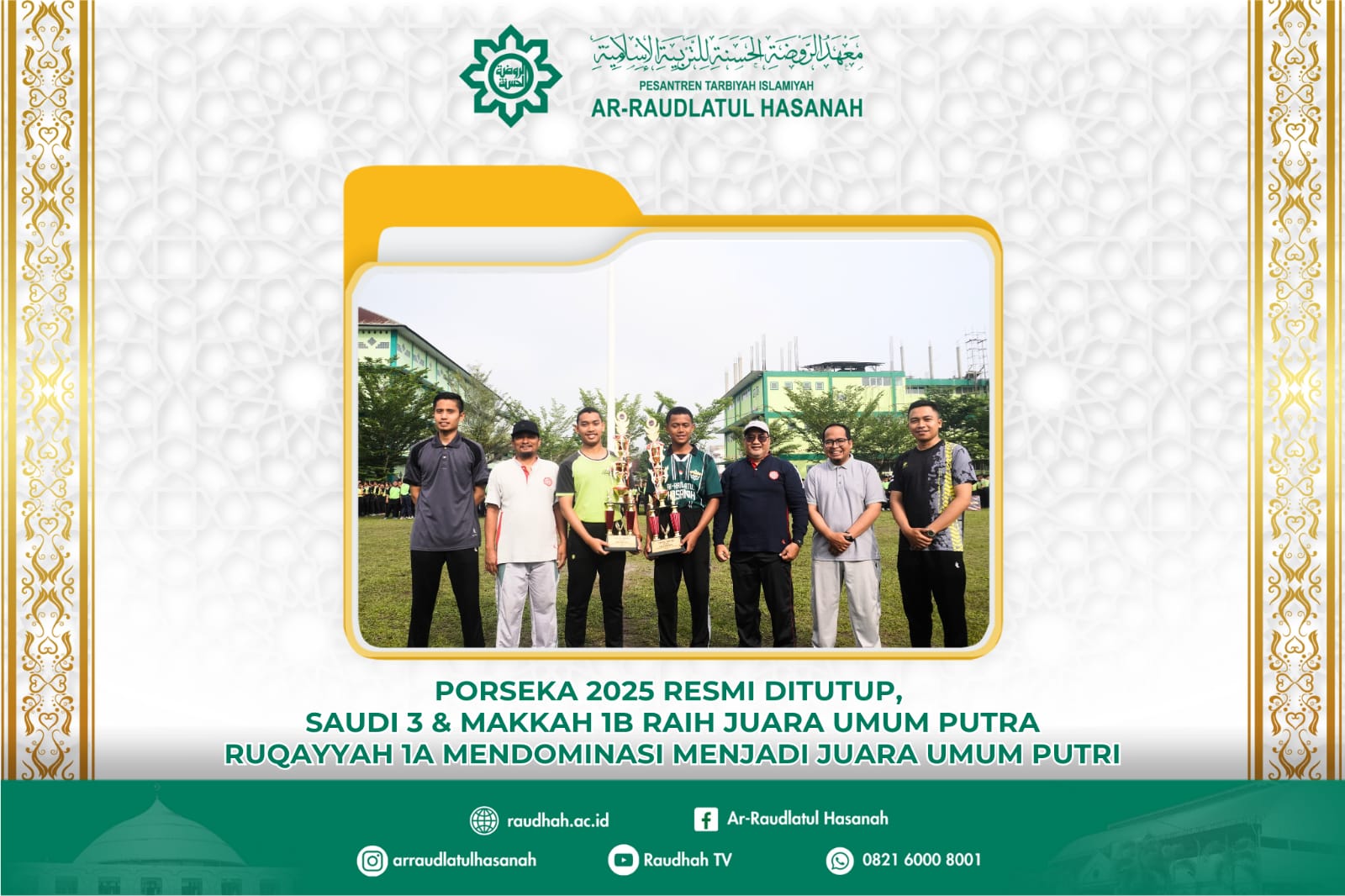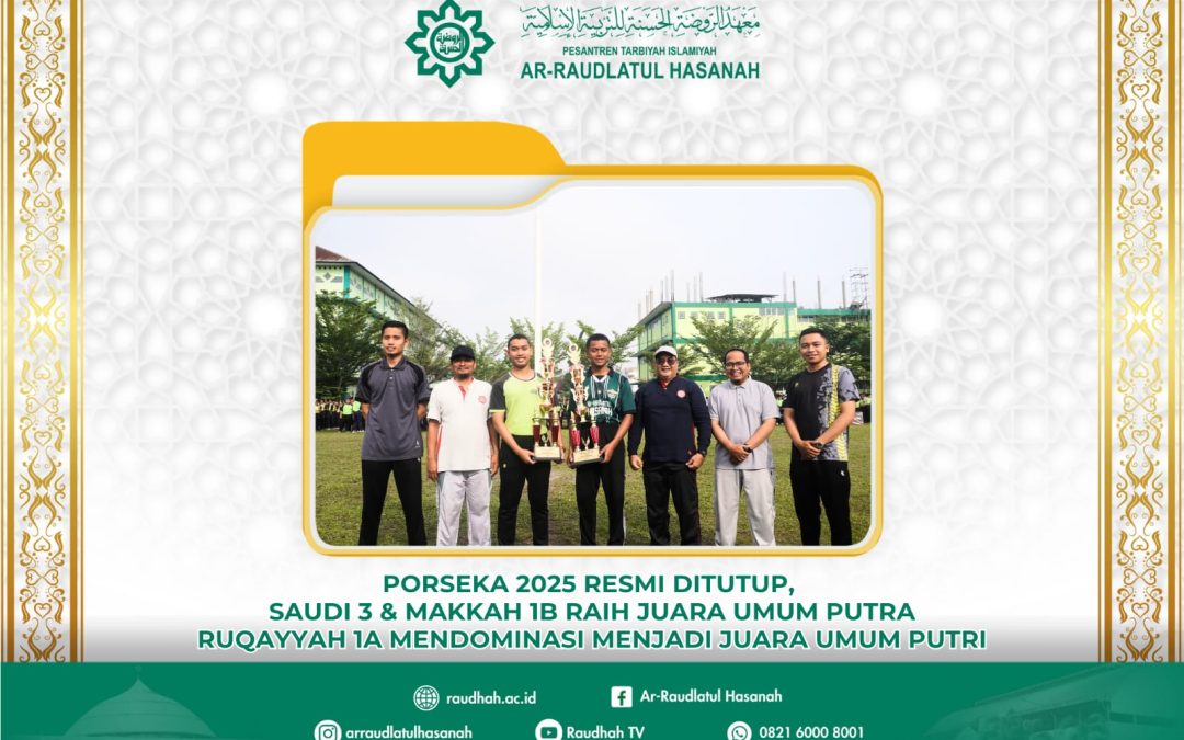 Dengan berakhirnya PORSEKA 2025, para santri putra maupun putri telah menunjukkan semangat sportivitas, kreativitas, dan persaudaraan. Kemenangan yang diraih bukan hanya soal piala, tetapi juga tentang pengalaman berharga dan kebersamaan yang akan dikenang sepanjang perjalanan menuntut ilmu di Pesantren Ar-Raudlatul Hasanah.